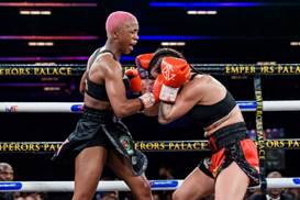 Unbeaten Simamkele Tutsheni on her way to a dominant points win against Cape Town’s Caleigh Swart during her win at Emperors Palace in August 2025.