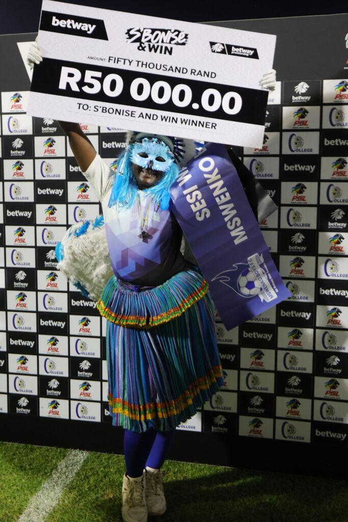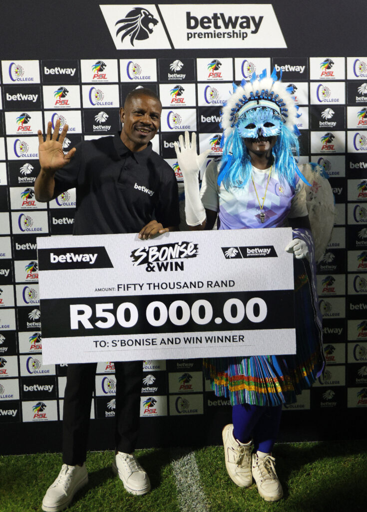 The excitement of the Betway Premiership S’bonise & Win campaign continued in Rustenburg as supporter Pumzile Bissewalked away with R50 000during the Dial Up fixture between Orbit College and Mamelodi Sundowns at the Olympia Park Stadium on Tuesday evening.